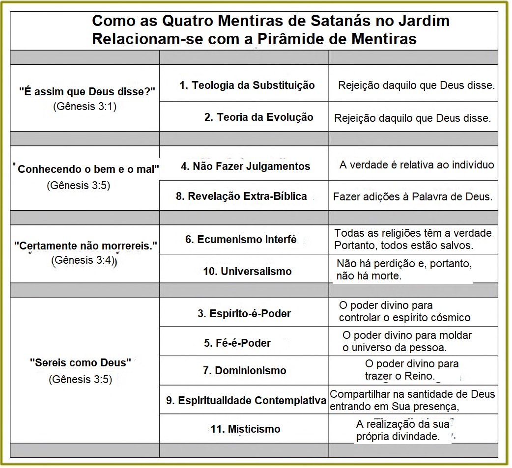 Exatamente doze anos atrás publicamos um ensaio intitulado "A Pirâmide de Mentiras: Como uma Alcateia de Lobos Está Atacando e Destruindo o Cristianismo Bíblico", em que examinamos o modo como o Maligno usa mentiras específicas, onze no total, para solapar e corromper a doutrina cristã. Essas onze mentiras, por sua vez, estão baseadas em quatro mentiras contadas por Satanás no Jardim do Éden, como ilustrado no diagrama mostrado a aseguir.