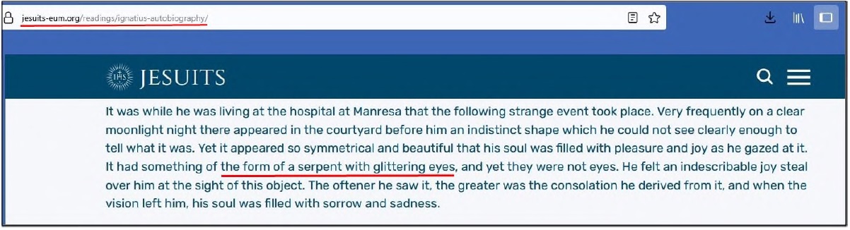 A citação vem direto da autobiografia de Loyola, onde ele fala de si mesmo na terceira pessoa. Em outras palavras, ele está descrevendo a experiência mística em suas próprias palavras. Incrivelmente, ele diz que sentium uma "alegria indescritível" quando viu essa entidade sobrenatural que tinha "a forma de uma serpente".