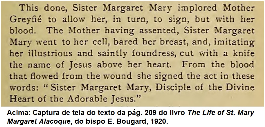 A mística que referenciamos anteriormente foi Margarida Maria Alacoque, que nasceu em 1647, que seguindo uma visão da Rainha do Céu aos 15 anos de idade, tornou-se uma freira professa na Ordem da Visitação de Santa Maria. Em uma biografia publicada em 1926, foi dito que, após muitas alegadas visões de Jesus Cristo, ela decidiu escrever um testamento pessoal com seu próprio sangue, doando sua vida completamente para Jesus. Tendo buscado e recebido a aprovação de suas superiores, ela "foi para sua cela, desnudou seu seio e, imitando sua ilustre e e piedosa fundadora [Santa Jane Frances de Chantal]. cortou com uma faca o nome de Jesus acima de seu coração. Com o sangue que saiu do ferimento ela assinou o ato com as seguintes palavras: "Irmã Margarida Maria, Discípula do Divino Coração do Adorável Jesus."