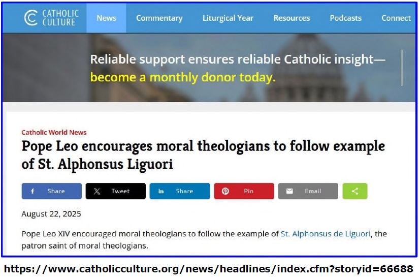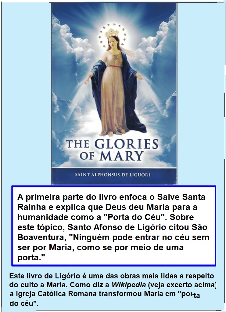 Vatican News (20 de agosto de 2025) disse que o Papa Leão 14 está dando maior destaque a Ligório e aos seus escritos. Isto é importante, porque um dos livros mais influentes sobre a "Rainha do Céu" As Glórias de Maria foi esrito por Ligório. Como diz a Wikipedia (veja acima), Ligório ensina que Maria é a porta da salvação por meio da qual todas as almas entram no céu. Ele também ensina que Maria é o conduíte por meio do qual a graça de Deus é liberada para a humanidade. (Cristo é a "cabeça", mas Maria é o "pescoço" por meio do qual essa graça flui). Ligório, que usavava essa analogia da cabeça e do pescoço, enfatizava que essa combinação era do agrado de Deus, desse modo tornando Maria um meio necessário de salvação e um veículo para recebermos o favor de Deus. Ele até descreve Maria como "a mediadora da paz" entre Deus e os pecadores.