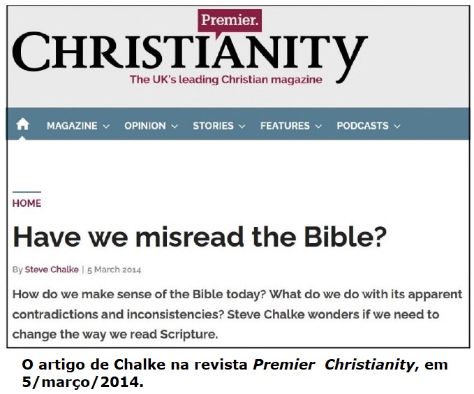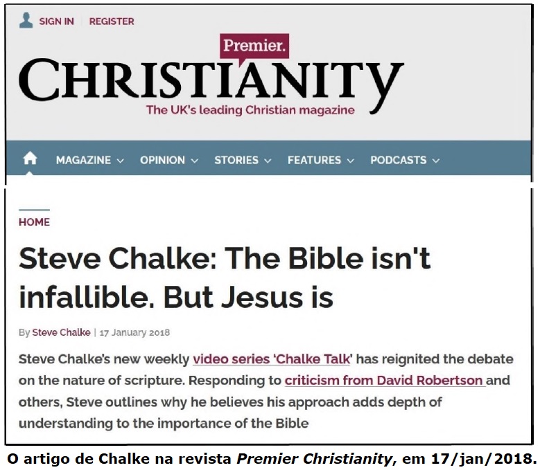 Em vez de discutir este assunto no abstrato, gostaríamos de referenciar um artigo escrito pelo pastor Steve Chalke, que um leitor habitual trouxe recentemente à nossa atenção "A Bíblia Não É Infalívez, Mas Jesus É" que foi publicado pela revista Premier Christianity em 17 de janeiro de 2018. Também faremos referência a um segundo artigo escrito pelo pastor Chalke "Estamos Lendo a Bíblia de Forma Errada?" que apareceu na mesma revista em 5 de março de 2014.