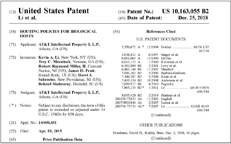 A companhia AT&T é a detentora da patente. O trabalho de pesquisa que está por trás da patente certamente foi realizado muito antes de ela ser aprovada no dia de Natal de 2018. (Quem registra um documento oficial no dia de Natal? Entretanto, para os pagãos essa é a data de nascimento de Ninrode, o homem divinizado da Babilônia. que prefigura o Anticristo.)