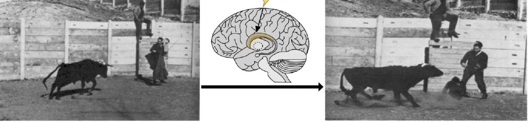 Em uma experiência famosa feita por Rodrigo Delgado em uma fazenda de criação de touros em Córdoba, na Espanha, em 1963, o cientista entrou em um cercado com um touro que tinha recebido um eletrodo em uma parte específica de seu cérebro. Quando o touro arremetia contra ele, Delgado conseguia paralisá-lo instantaneamente transmitindo um sinal de rádio: