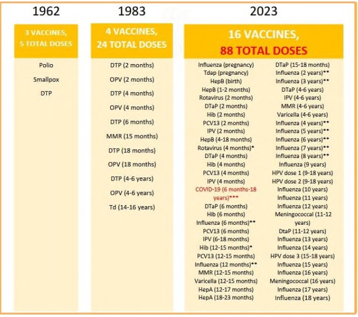 A autoindicada elite governante está interessada na vacinação em massa? É claro que sim. Nos últimos dez anos, ou mais, eles a saudaram como a solução perfeita para os inúmeros problemas de saúde e todas as pandemias. Muitas pessoas estão agora sendo vacinadas todo os anos contra a gripe, embora a gripe não seja uma doença pandêmica. O número de injeções recomendadas que são dadas às pessoas com menos de 18 anos nos EUA subiu de 3 vacinas (no total de 5 doses) em 1962 para 18 vacinas (em um total de 88 doses) em 2023.