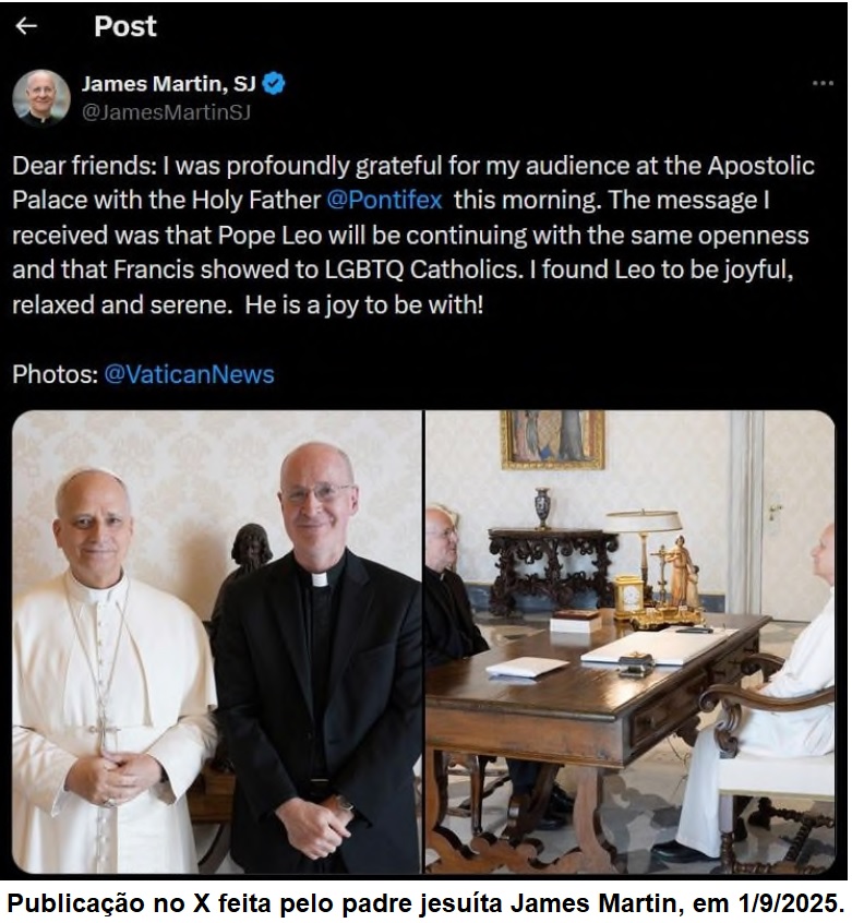 Bem, ele respondeu a essa pergunta quando se encontrou com a freira dominicana Lúcia Caram, em 28 de agost0 de 2025. Caram é bem conhecida por seu apoio declarado ao aborto e aos direitos LGBT. Alguns dias mais tarde, em 1 de setembro, Ele teve outra audiência privada, dessa vez com o sacerdote católico James Martin SJ. Martin está dedicado em tempo integral à promoção da agenda homossexual dentro da Igreja Católica. Depois do encontro, o sacerdote jesuíta publicou uma mensagem na plataforma X para confirmar que, após a discussão entre eles, "o Papa Leão continuará com a mesma abertura que o Papa Francisco mostrou para os católicos LGBT."