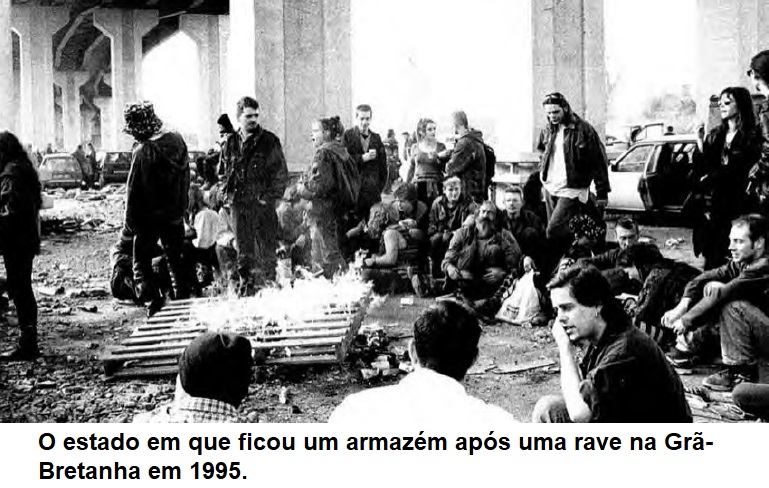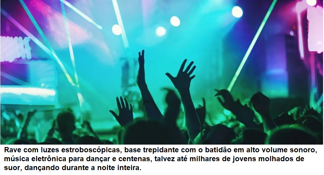 Rave com luzes estroboscópicas, batidão, música para dançar em alto volume sonoro, e centenas, ou até milhares de jovens molhados de suor e dançando até o amanhecer.